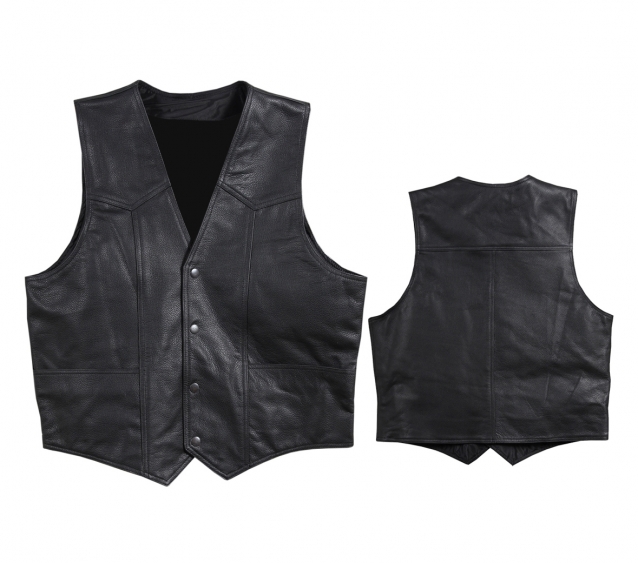 - 100% drum dyed Leather - Classic Black Biker Look - 4 Snap Button Front Closure - Multiple external and internal pockets .